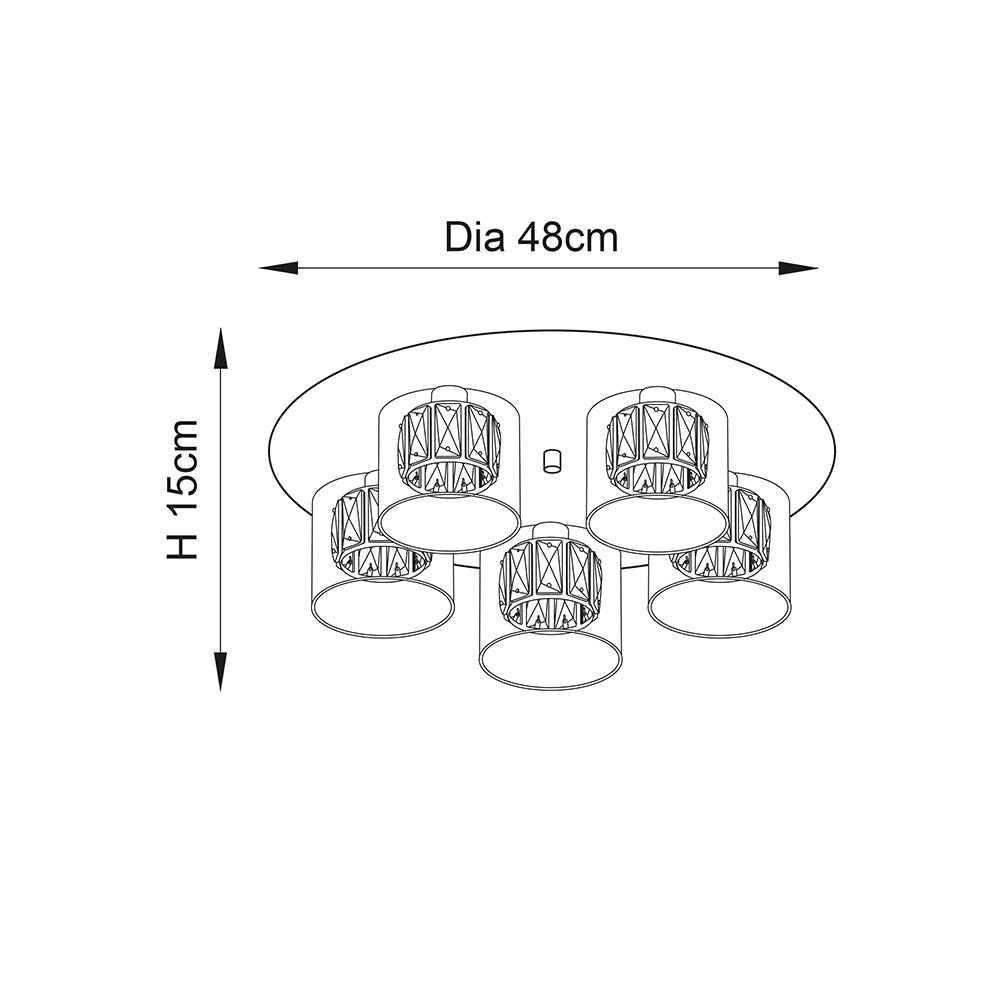 Upgrade your interior design with the Verina 5 Light Flush Ceiling Light. With high quality clear crystals and a polished chrome finish, this deluxe fixture adds a touch of luxury to any room. The crystal shades and glass diffusers provide a striking and elegant look, perfect for low ceilings. Elevate your space with this beautiful and functional ceiling light.